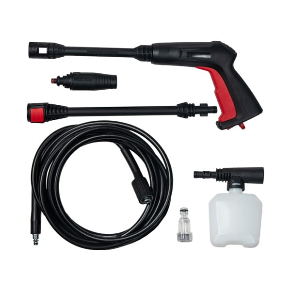 Conta com um reservatório especialmente projetado para liberar a quantidade certa de espuma para evitar que haja desperdício de detergente no pavimento, além disso, é equipada com dois modelos de lança: a de leque ajustável, que possui um bico com design de pressão ajustável de acordo com sua demanda de trabalho e lança turbo para limpezas mais pesadas. Mangueira e cabo de energia com 5 metros de comprimento (cada) para manter todos os trabalhos ao seu alcance e ainda conta com um sistema de segurança inteligente: a função AUTO STOP, que desliga o motor caso o usuário solte o gatilho do equipamento, permitindo reduzir o consumo de água e proporcionando uma maior vida útil a máquina.